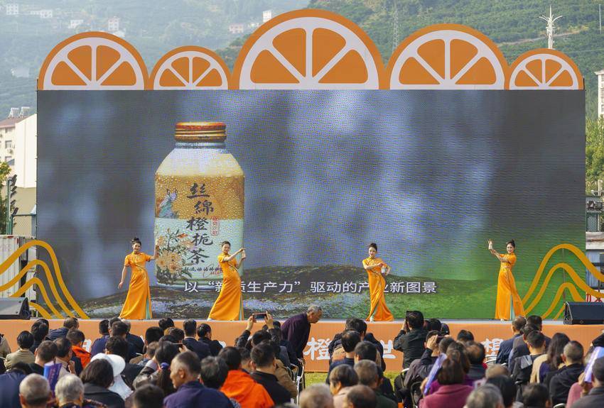 2025年11月15日,湖北省宜昌市秭归县水田坝乡,“秭归脐橙香 甜暖您的秋”九月红脐橙开园活动现场发布新品橙栀茶。