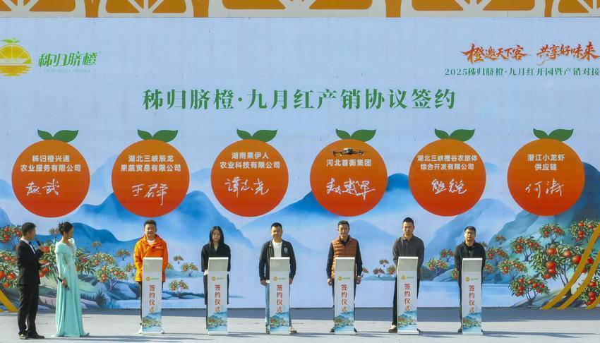 2025年11月15日,湖北省宜昌市秭归县水田坝乡活动现场,九月红脐橙产销对接签约。