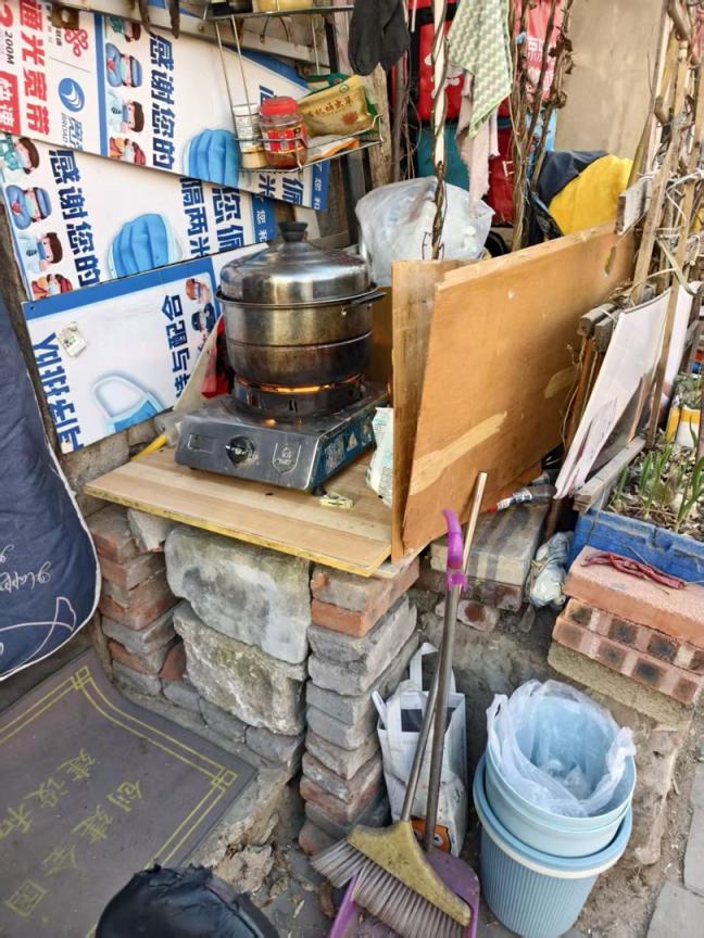 玉泉路11号院平房区屋外明火做饭,四周有不少易燃物。