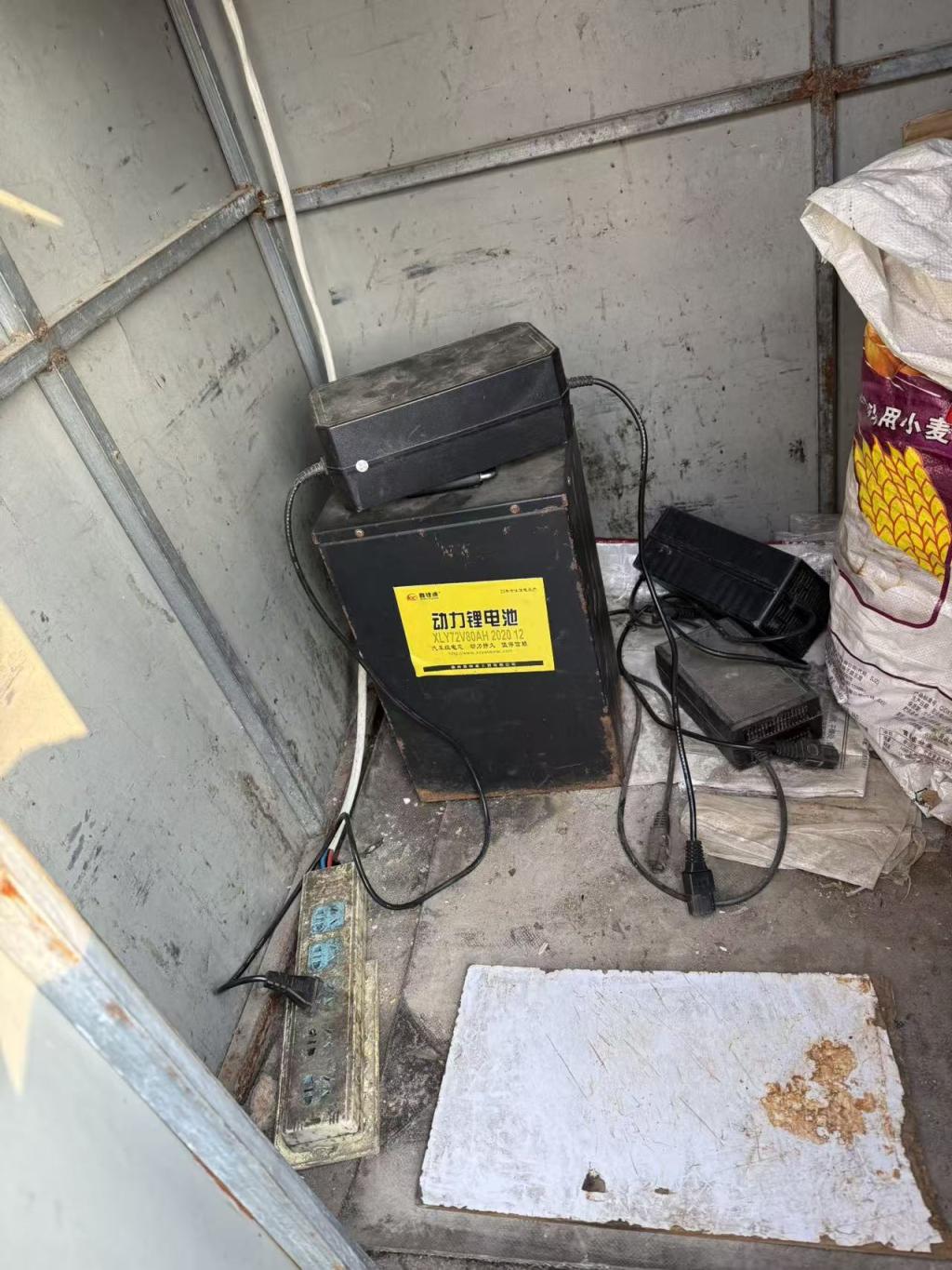 东晓市街的一辆三轮车内不仅有满是污泥的插线板,还有大块的锂电池及充电器。