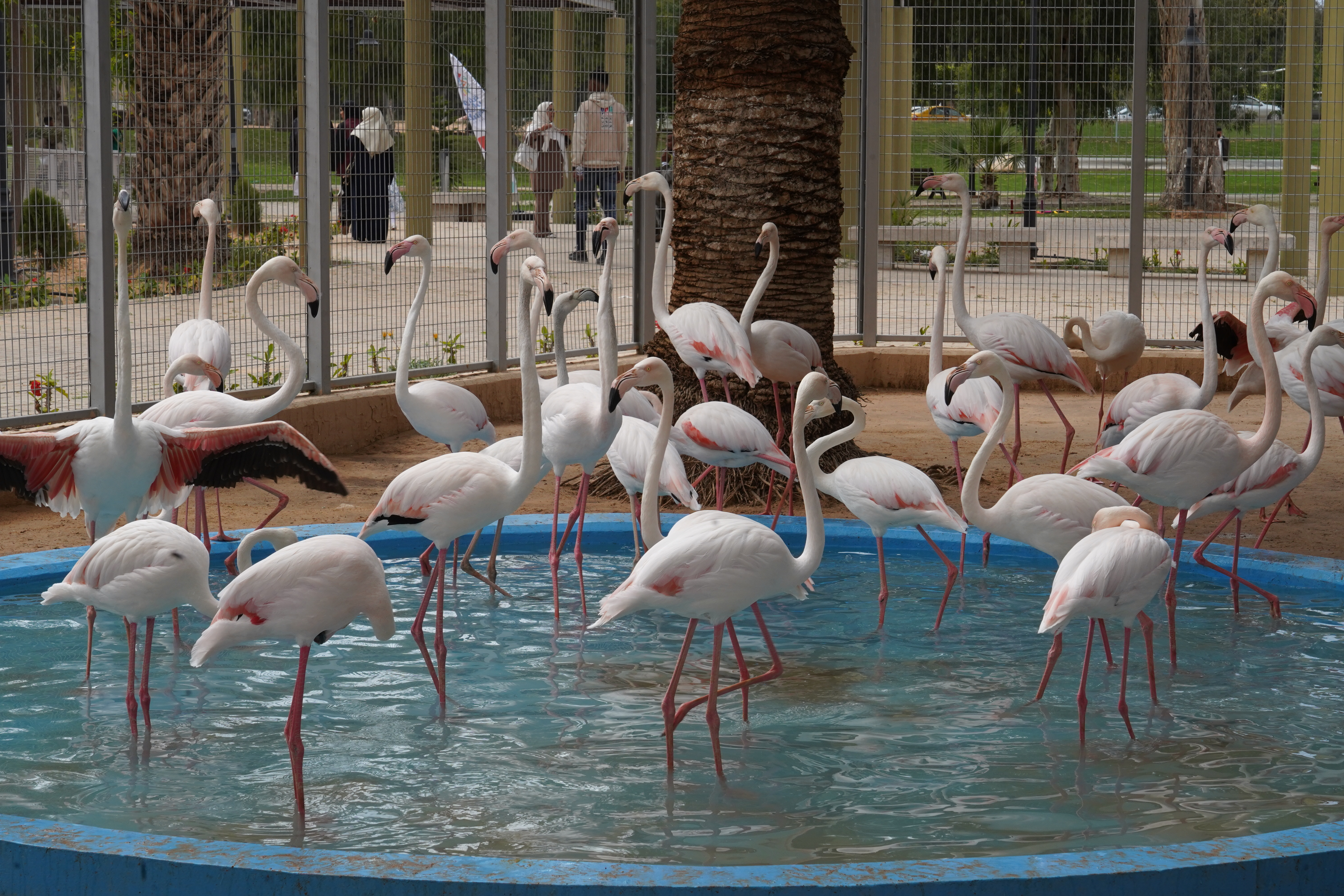 这是3月20日在利比亚首都的黎波里动物园拍摄的火烈鸟。